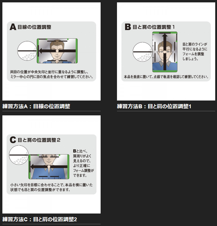 ミラーのラインに合わせてボールの横に置くことで、ストローク時の頭の移動が確認できるパター練習器です。中央の矢印に合わせて、目や肩などの位置を鏡で調整できるので、正しいアライメントが身に付きます。また、コンパクトでかさばらないので、キャディバッグのポケットに入れたり、携帯に便利です。(ほぼ免許証と同じサイズ)