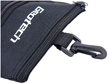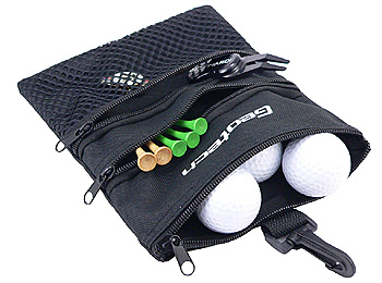 ボールやティー、グリーンフォーク、マーカーなどを収納できるジオテックオリジナルポーチ。冬場などの寒い時期では、ボールを入れておくことで保温効果があり、飛距離低下を防げる。フック付きなので、キャディバッグにぶら下げて必要なときにすぐ取り出せる。また乗用カートでもカート内のカゴに入れておけば便利。