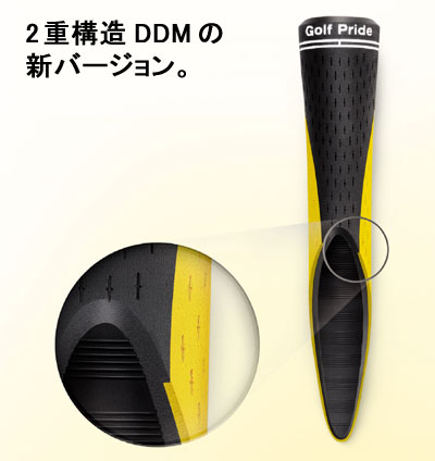 2重構造で緩まない安定した握りを実現するDDMの新モデル。グリップの黄色い部分に軟らかいラバー素材を使用し、黒い部分とツーピース構造がねじれを抑制。これにより軟らかい握り感を実現しながら、インパクト時にもグリップが緩まず、パワーを最大限にボールへ伝達できる。