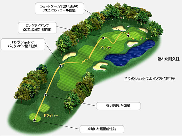 ソフトなコアがロングショットでの余分なバックスピン量を軽減し、高い飛距離性能を実現します。