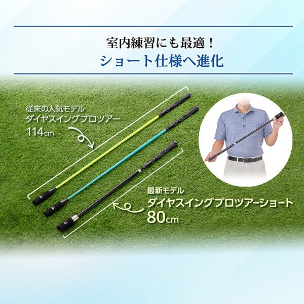 室内練習にも最適!ショート仕様へ進化 従来の人気モデル『ダイヤスイングプロツアー』の機能性はそのままに、 全長80cmの短尺仕様にしました。限られたスペースでも扱いやすく、 自宅でのスイング練習が日常に取り入れやすくなりました。 |