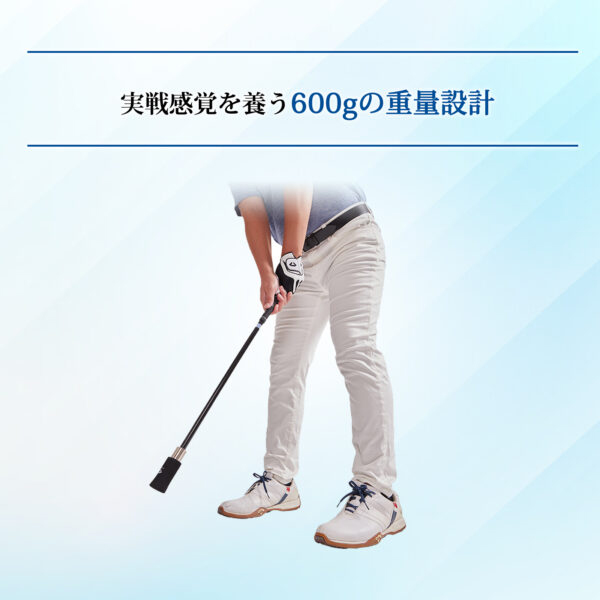 実戦感覚を養う600gの重量設計 短尺ながら600gの重量感を確保。クラブ以上の負荷でしっかりとした振り応えを実現し、 スイングフォームを崩さず効率的に改善できます。 |