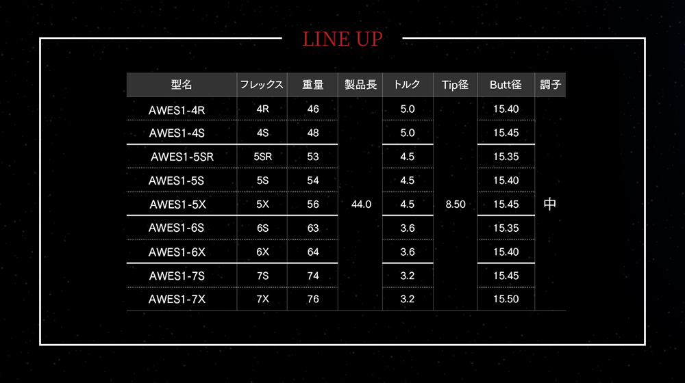 | Code | Flex | GeoFlex | Club No. | Tip | Tip Type | Butt | Len. | Weight | Trq. | K.P. | Trimming | CPM | B.P. | Tip Stf. | Butt Stf. | Price(JPY) |