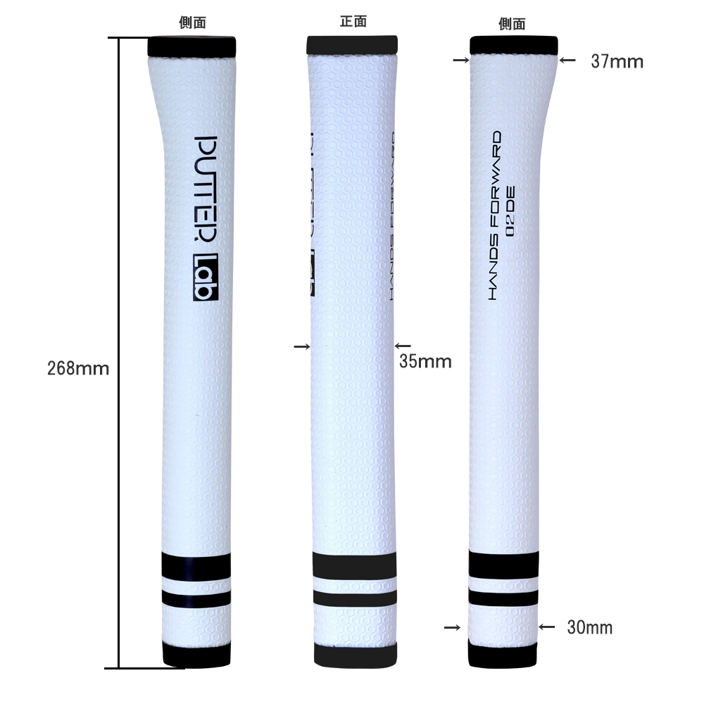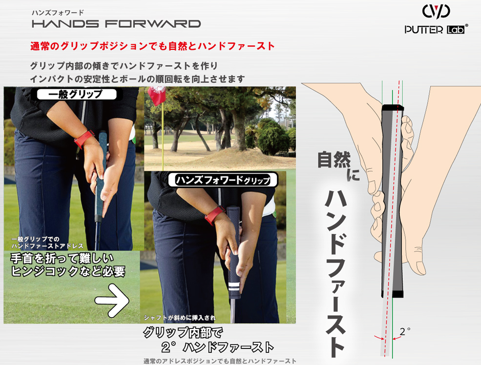 【PT-Lab-G HF02DE】 パターラボグリップハンズフォワード 02 右用 通常のアドレスポジションをとるとシャフトが右に傾き自然とハンドファーストに構えているようになります。 ヒンジのコックを作らなくても自然とハンドファーストになりロフト角が減ると同時に強いインパクトが迎えられ 綺麗な回転でボールが転がります。※右打ち専用モデルになります。 |