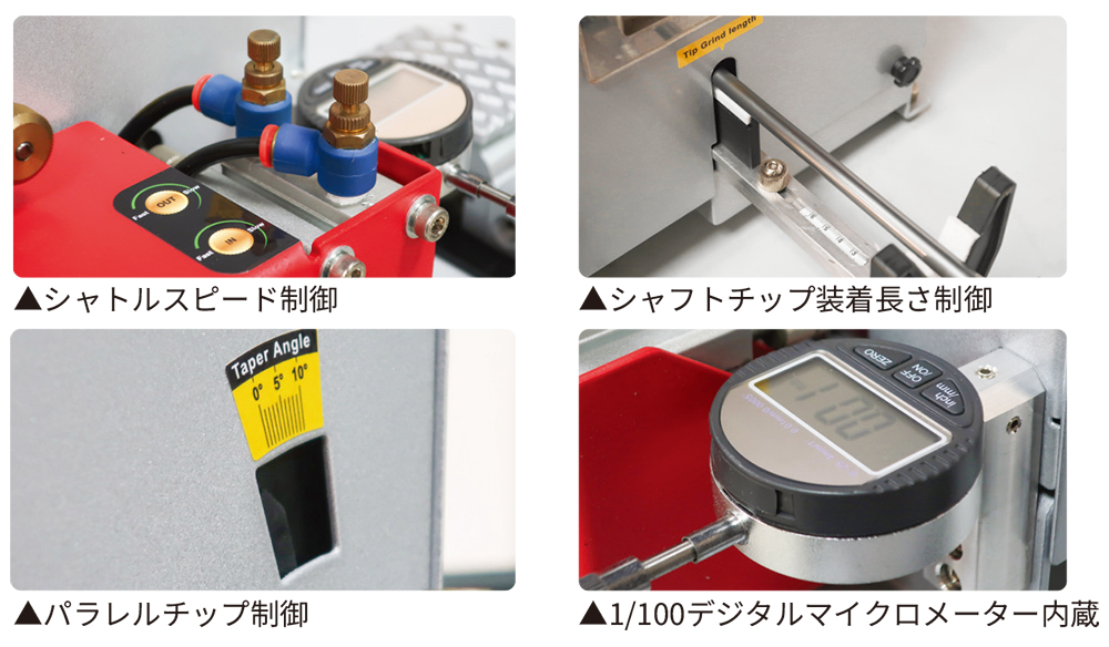 空圧を利用してシャフトのチップサンディングをセミオートマチックに行うことが可能な研磨機。 研磨厚や研磨長さ等、セッティングを行う必要があるため、数多くの研磨が必要な組立工場等に適しています。 ◇材質◇ スチール・アルミニウム ◇標準機能◇ ・½ Hp motor 1700 RPM ・標準の研磨ベルト 1本 ・センターレスチップ準備 ・トップコートのはがし深さと長さのコントロール ・1/100デジタルマイクロメータ内蔵 ・空圧シャトル制御 ・平行先端制御のための調整可能な駆動角度 ・集塵フード ・Eスイッチ |