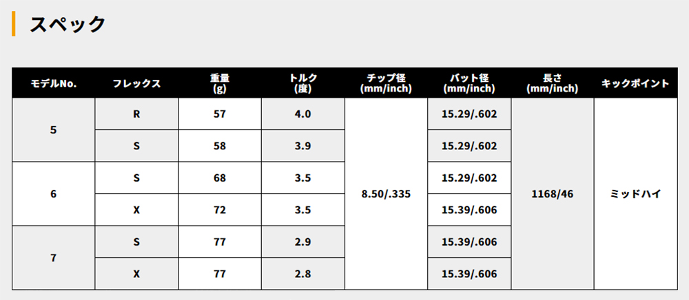 | 3106CF06 | S | 8.50 mm | ウッド.335 | 15.29 mm | 46.0 インチ | 68.0 g | 3.5 度 | 中元 | B-04 |