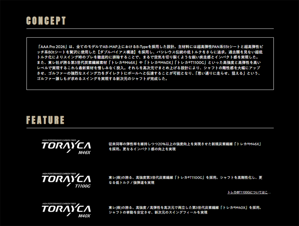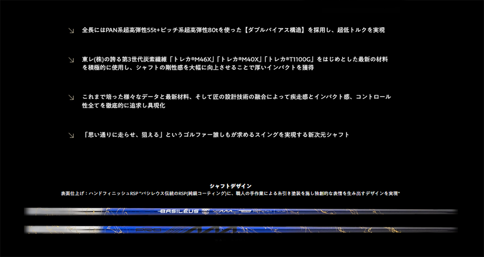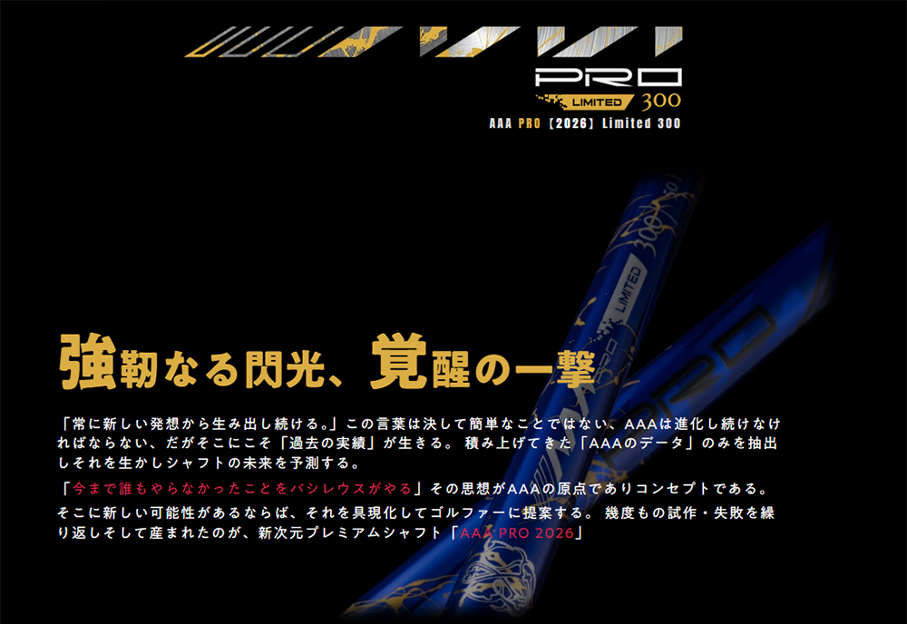 全スペック合計300本限定 素材の使用限界を取払い、設計力を余すことなく生かせる条件を整え産み出された"AAA<トリプルエー>" 特殊な素材を用いて、追い込んだ設計をすることから生産数は自ずと300本限定のモデルとなる 今まで積み重ね、過ぎた歳月には取り巻く環境の変化もある。 ヘッド性能の進化・ボール性能の進化・グリップ性能の進化。 取り巻くそれらも含めての「進化」である。 AAAシリーズにおいては「理論上可能であれば挑戦する」事が命題である。 それを求めるゴルファーがいると確信し、バシレウスはそれをゴルファーに提案できることに喜びを感じる。 開発者としては、かなりの挑戦的な素材選択である。自ずと、適材適所の見極めが難しい。 だからこそ、そのシャフトを渇望するゴルファーが、そこで待っていると確信し開発に挑戦する。 AAA2026モデルはゴルファーに対しても挑戦的なシャフトと言える。 |