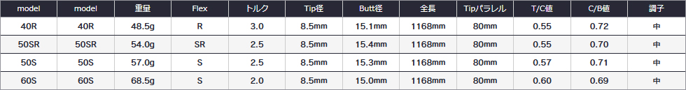 | Code | Flex | GeoFlex | Club No. | Tip | Tip Type | Butt | Len. | Weight | Trq. | K.P. | Trimming | CPM | B.P. | Tip Stf. | Butt Stf. | Price(JPY) |