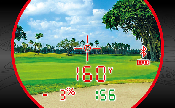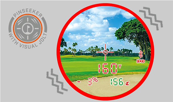 ダブルジョルト機能(バイブレーション) ピンフラッグなど細い目標物測定時にピンシーカー機能が作動した際、 本体がビビッと振動。 同時に視界上にレッドリングが発光。 測定完了を瞬時に視覚、体感で把握できる便利な機能。 |
