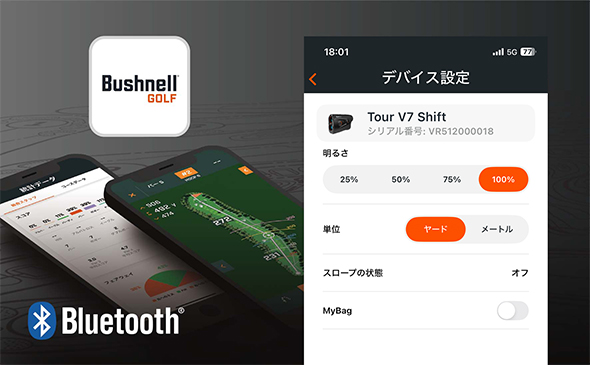 Bluetooth®搭載 Bushnell GOLF アプリと連動させることで下記の変更が可能。 1.4段階の明るさ調整 2.メートル/ヤードの切替 |