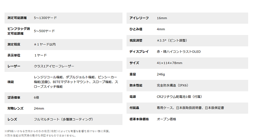 ◼︎ ピンフラッグ測定可能距離は5〜500ヤード ◼︎ ピンフラッグ測定可能距離は5〜500ヤード ◼︎ ダブルジョルト機能(バイブレーション) ◼︎ BITEマグネットマウント ◼︎ 雨天使用可能。タフに使える完全防水構造(保護構造:IPX6) ◼︎ ピンフラッグなど細い目標物の測定を助けるピンシーカーモード ◼︎ 6倍望遠&フルマルチコートレンズ ◼︎ 人に安全なクラス1レーザー使用 ◼︎ 16mmのロングアイレリーフ ◼︎ Bluetooth®搭載 ※Bluetooth®は、Bluetooth SIG,Inc.の商標です。/font> |