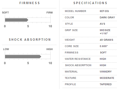 | 6DT-DG: Midsize Dark Gray ミッドサイズで衝撃吸収性を高め、どのような天候でもグリップ性能を損なわないグリップ。 エンドのブルーがボディのグレーのアクセントになっています。 |